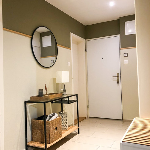 We used a piece of furniture that he already had making small adjustments and it started to serve as a shoe rack and sideboard. The painting and plants positioned above were the final touches to make the space harmonious.